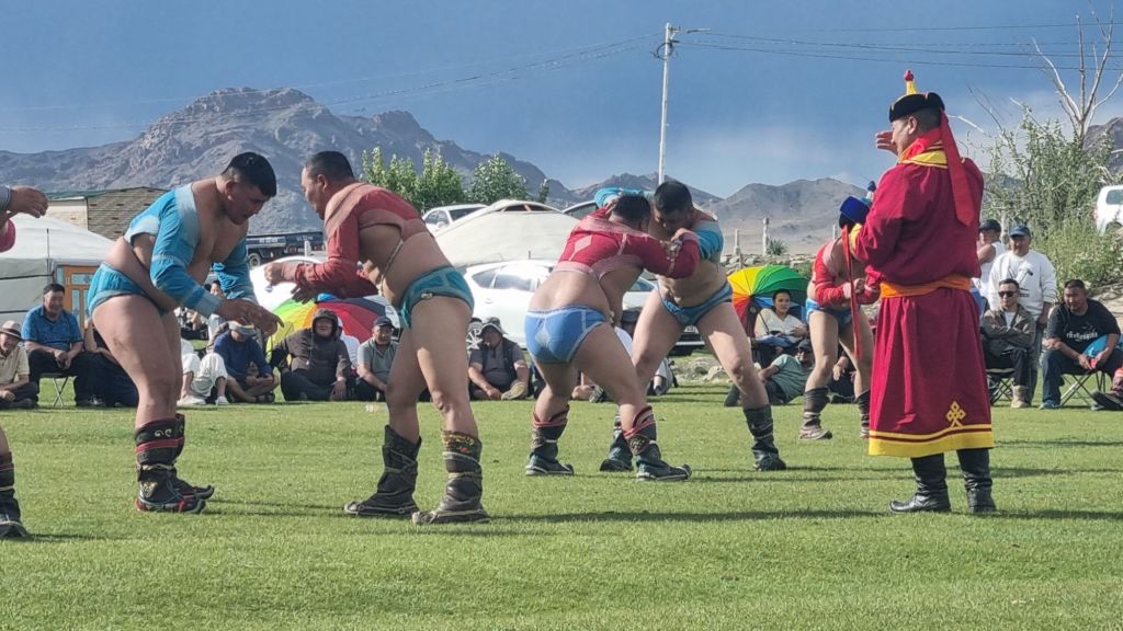Am letzten Abend bekommen wir plötzlich eine WhatsApp von Marvin aufs Handy – im Vorlauf zu den Naadam Spielen findet gleich ein Ringkampf-Wettbewerb unten an der ersten Brücke statt – ob wir Interesse hätten? Haben wir und so sind wir bereits ein paar Minuten später auf dem Platz an Fluss und Stadtrand,