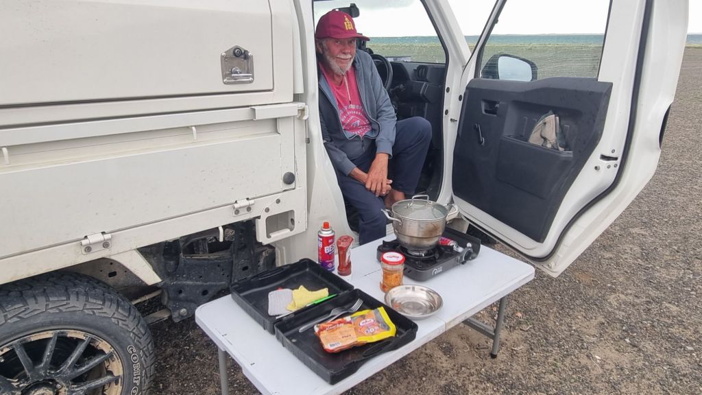Heute können wir den schönen See noch nicht genießen, denn es nieselt den ganzen Rest des Tages. So gibt es Würstchen mit Nudeln und eingelegtem Salat sowie den anschließenden „Trostwodka“ im Fahrerhaus und natürlich: Kaum haben wir im Regen das Dachzelt aufgebaut, hört das Getröpfel endlich auf!