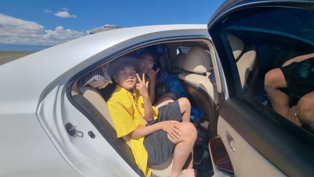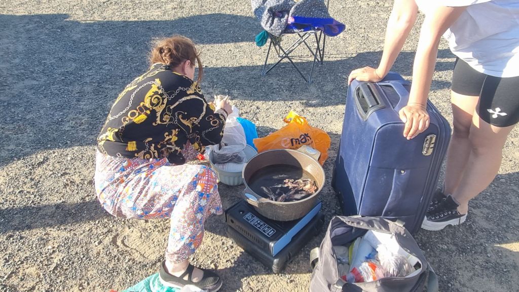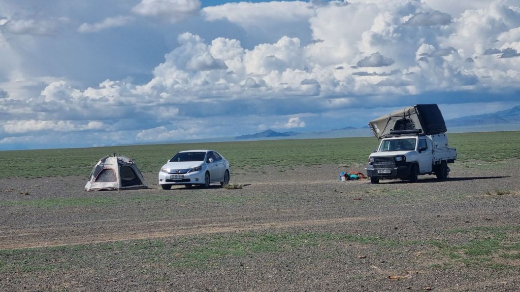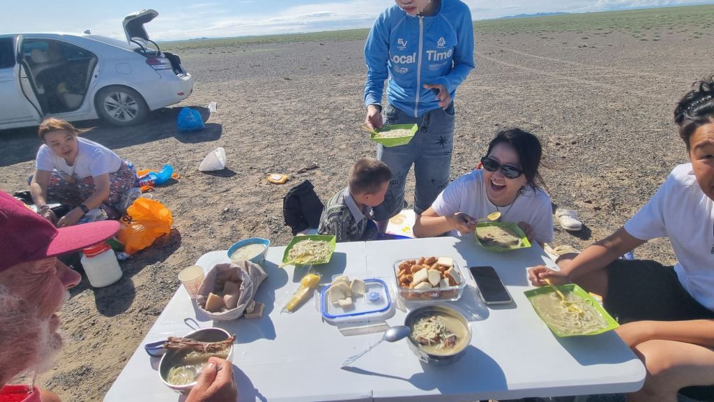 Beim Aufstehen am nächsten Morgen klärt sich das dann auf: Zwei ziemlich verrückte Frauen mit ihren vier Kindern: Uka und Shinee wollten von Darvi, also von dort, wo wir hin wollen, auf typisch mongolische Weise (wir fahren direkt!) zu unserem See. Dabei haben sie die Entfernung unterschätzt, sind in die Dunkelheit geraten, haben sich verfahren und sind mitten durch die Berge (der Heckspoiler liegt schon im Kofferraum!) bis hierher gekurvt. Na ja, da war es 2 Uhr und sie waren dankbar, dass sie uns und unser Dachzelt gesehen haben und so wenigstens wussten, dass man hier sein Zelt aufbauen kann. Von nun an ist Leben in der Bude. Wir werden kurz gefragt, ob wir Wasser haben (ist ihnen bei der Teufelstour nämlich auch ausgegangen). Nun wird unser Tisch besetzt, wir sind nun ungefragt Teil der Familie und bekommen erst einmal einen Beutel voll mit Ziegen-Trockenfleisch geschenkt – das gilt hier als Delikatesse.
