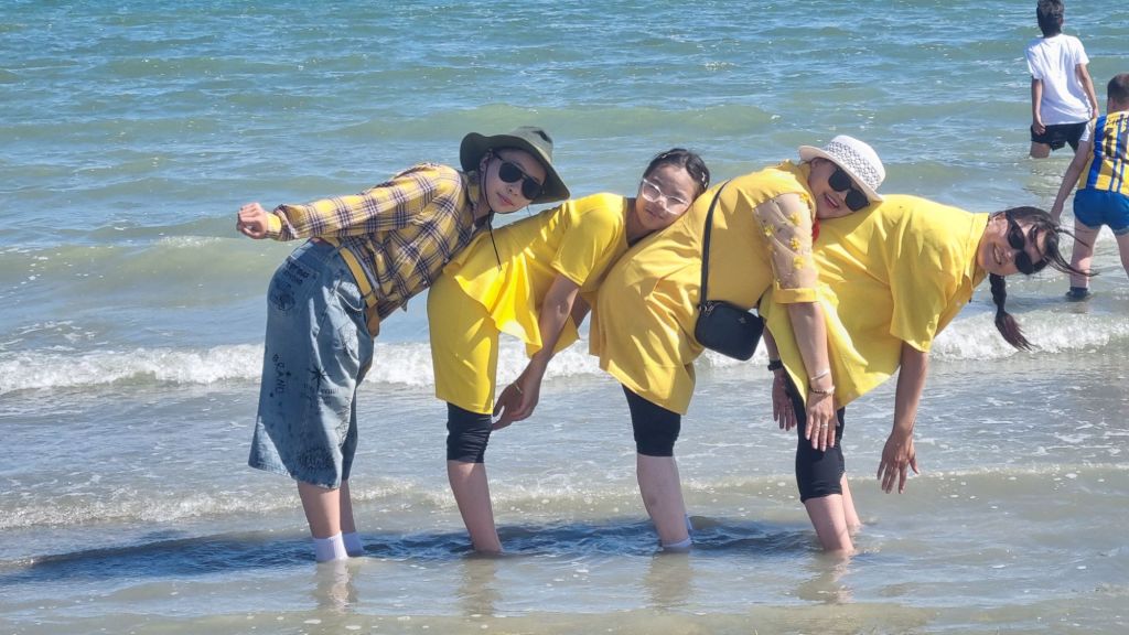 Nach dem leckeren „Spätstück“ wollen Alle ans Wasser und wir müssen natürlich mit. Doch zu unserem Erstaunen brezeln sich die vier Frauen erst einmal auf. Alle tragen gelbe Kleidung. Die beiden Jungen ziehen Gummistiefel an. Wie die Kinder tobt die ganze Familie im und am Wasser und dann beginnt (echt wahr!) eine einstündige Fotografier- und Selfieorgie! Es wird gepost wie blöd, wir können nur staunen!