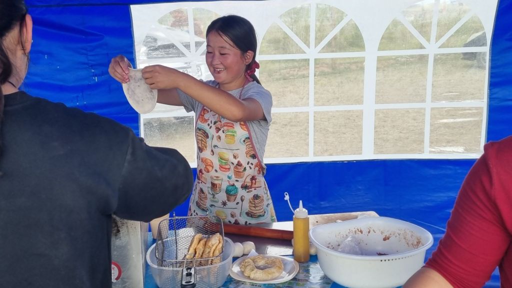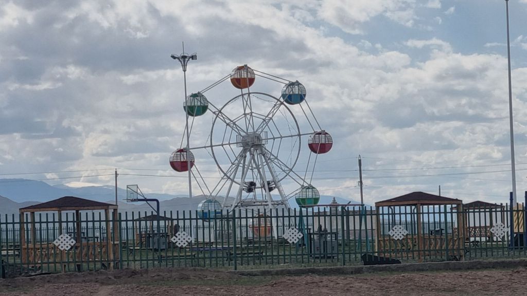 Während des Essens (für mich zum 5. Mal Tsuivan – langsam kenne ich das Gericht!) geht ein kleines Unwetter über Darvi runter (schrieb ich nicht schon mal: Wenn es in der Mongolei regnet, dann regnet es !)- gut, dass wir uns die Abschlussfeier geschenkt haben! Übrigens: Zwischen uns und dem Festgelände gibt es einen richtigen Vergnügungspark mit kleinem Riesenrad, Schiffsschaukel und Kettenkarussel.