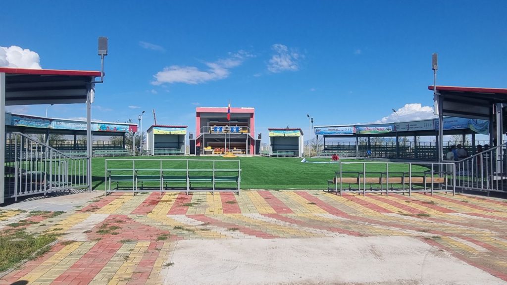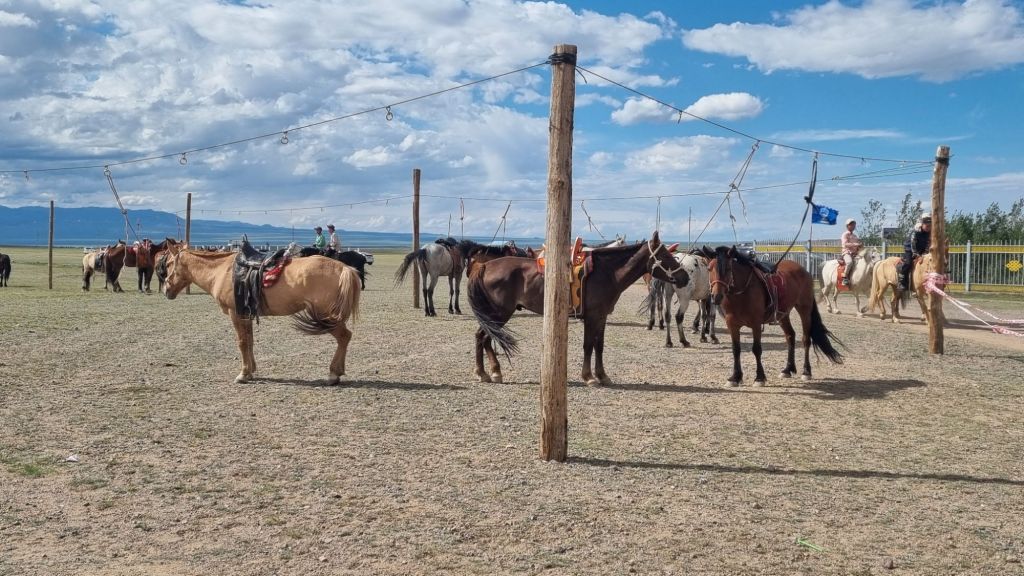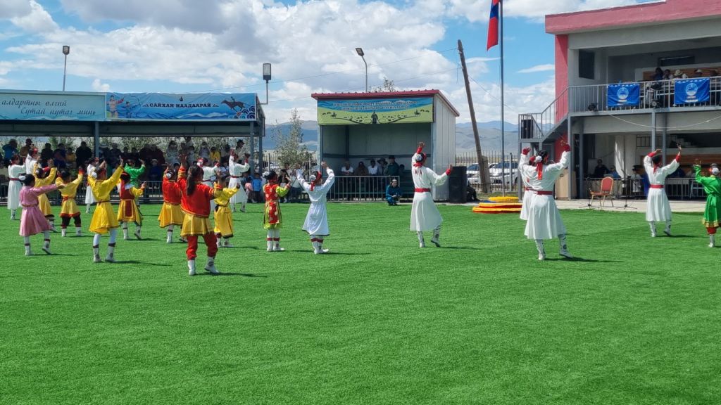 Danach wandern alle ins Stadion, denn nun wird der Naadam feierlich eröffnet – mit allem Pipapo, also Reden, Absingen der Nationalhymne, Tanzbeiträgen der örtlichen Schule und Pferdekopfgeigenmusik. Alles schön unaufgeregt, ländlich und nix Aufgesetztes – so wollten wir es haben!
