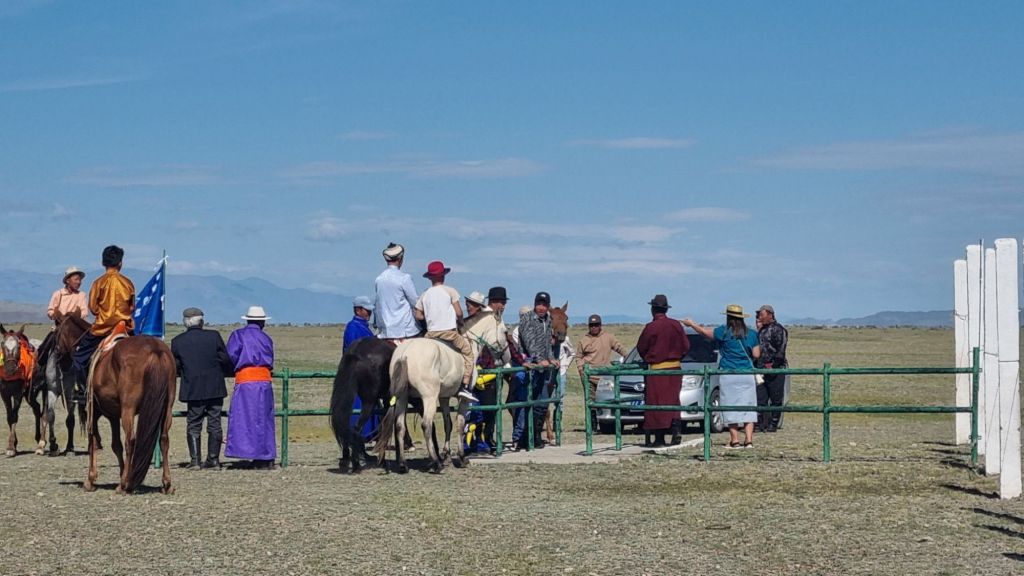und natürlich jede Menge Prius durch die Landschaft. Am Zieleinlauf ist schon eine Menge los, dort gehen wir zuerst hin. Hier werden die jungen Jockeys mit ihren Pferden registriert, bevor sie dann mehr als vier Kilometer hinaus in die Steppe reiten – begleitet von der Familie per Prius, denn der Kurs verläuft in Straßennähe, damit die ganze Verwandtschaft vom Auto aus anfeuern kann.