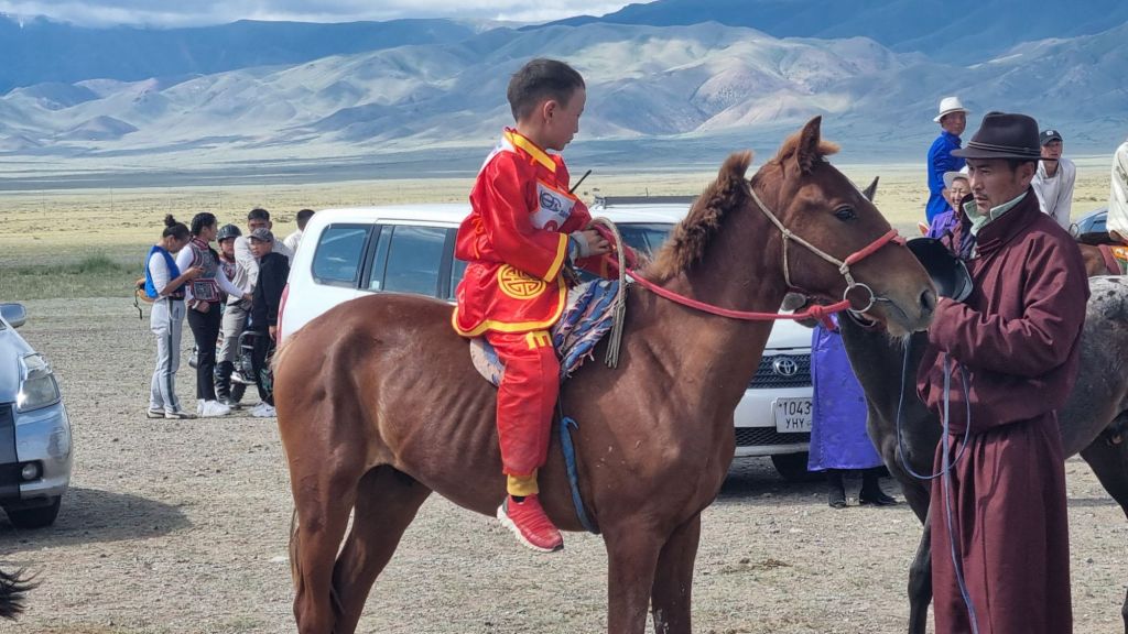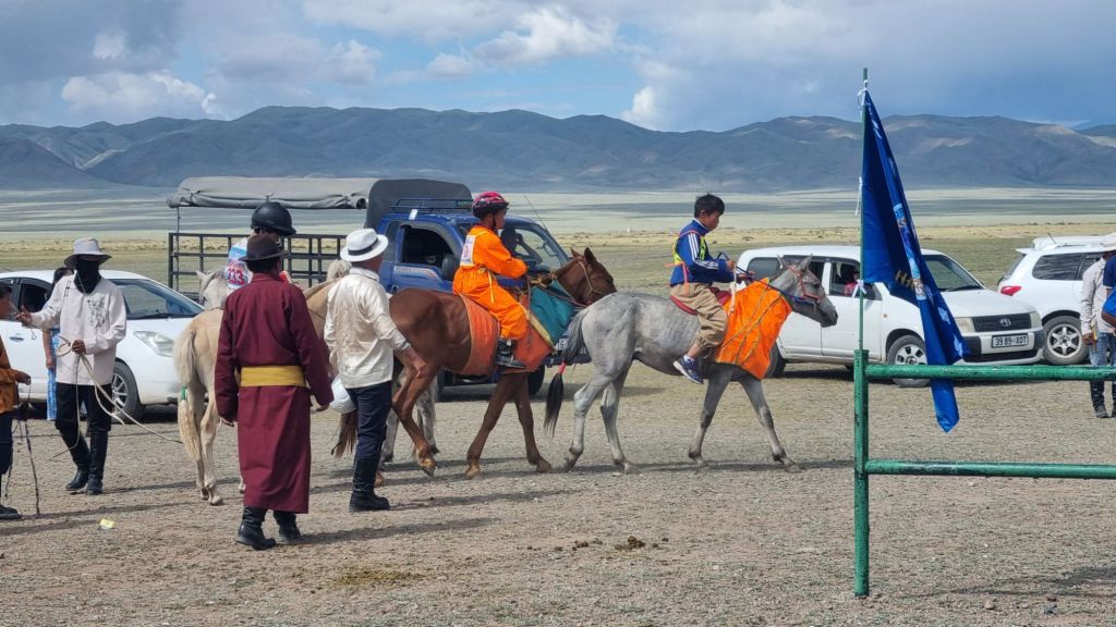 Dann warten wir, bis irgendwann auf der Straße ein Polizeiwagen mit Blaulicht erkennbar wird, gefolgt von einem Riesenkonvoi an PKW – natürlich hupend und mit viel Gejohle. Auf der Piste sieht man zuerst ein Motorrad mit mongolischer Fahne, der Fahrer gibt die Richtung vor, so dass sich von den Kindern auch niemand „verreitet“. Dann geht alles ziemlich schnell: Nach Überquerung der Ziellinie werden Pferd und Reiter von Mitgliedern der Familie „eingefangen“ – die jungen Helden werden geherzt, die Pferde zum Abkühlen langsam im Kreis geführt und dabei trocken gerieben.