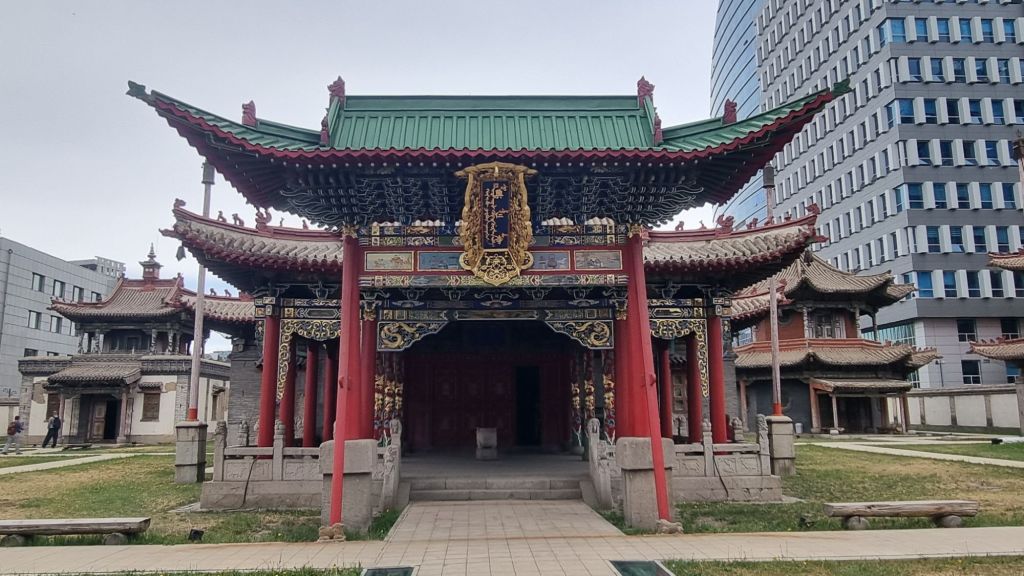 Endlich ist es 10 Uhr und wir können nach fast 24 Stunden ins Bett. Kurz vorm Wegdämmern richte ich auf Kathrins Handy noch schnell maps.me ein, dann fallen wir Beide bis 16 Uhr ins Koma. Wieder wach, fällt uns dann beim Suchen nach Restaurants in der Nähe schon auf, dass sich Airolo, der Betreiber unserer E-Simkarten, wohl für die Mongolei den falschen Telekommunikationspartner gewählt hat, denn Skytel ist selbst hier in UB sehr schwach vertreten, also werden wir morgen wie von Itgel empfohlen zu Unitel wechseln. Heute geht es erst einmal zum Restaurant „Veranda“, 15 Minuten zu Fuß entfernt und direkt neben dem Tschoidschin-Lama-Tempel-Museum, dem wir morgen einen Besuch abstatten wollen. Überhaupt liegt, sofern man eine Übernachtungsgelegenheit im Zentrum gefunden hat, alles Wichtige in fußläufiger Entfernung. Heute gibt es jedenfalls Lammspieße und Steak, dazu (wie könnte es anders sein!) Chinggis-Khan-Bier!