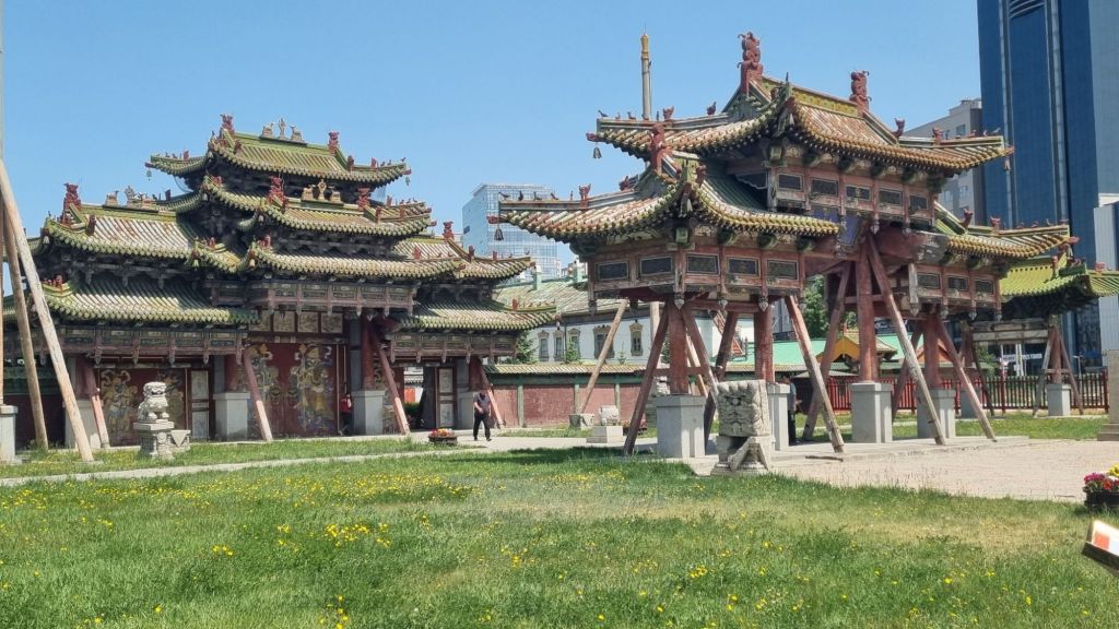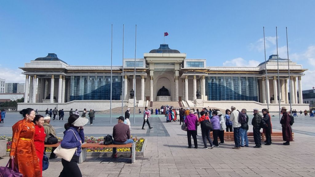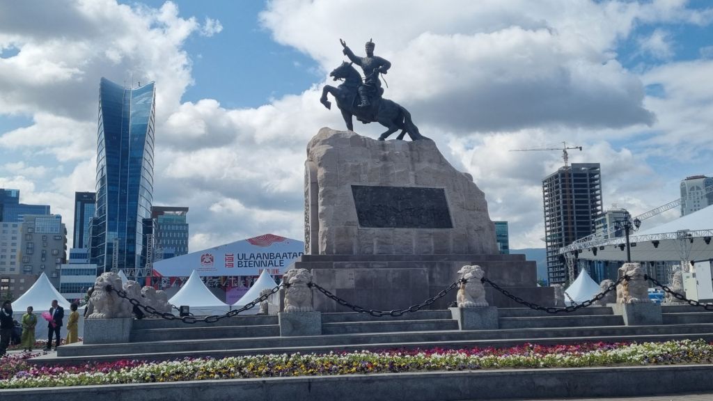 Heute ist Sightseeing angesagt. Wir entdecken ein paar Meter neben unserer Unterkunft eine Sauerteig-Bäckerei und lassen es uns beim Frühstück draußen gut gehen: Kathrin genießt einen Sandwichtoast mit Chili con Carne und ich gönne mir ein Englisches Frühstück. Ordentlich gestärkt geht es zuerst zum zentralen Sukhbaatar-Platz. Vor dem Parlament thront Chinggis Khan, der den Riesenplatz überwacht. In der Mitte steht ein Reiterdenkmal von Sukhbaatar und im hinteren Teil sind eine Menge Zelte, Gers (Jurten) und eine gewaltige Bühne aufgebaut, denn hier ist gerade Biennale.