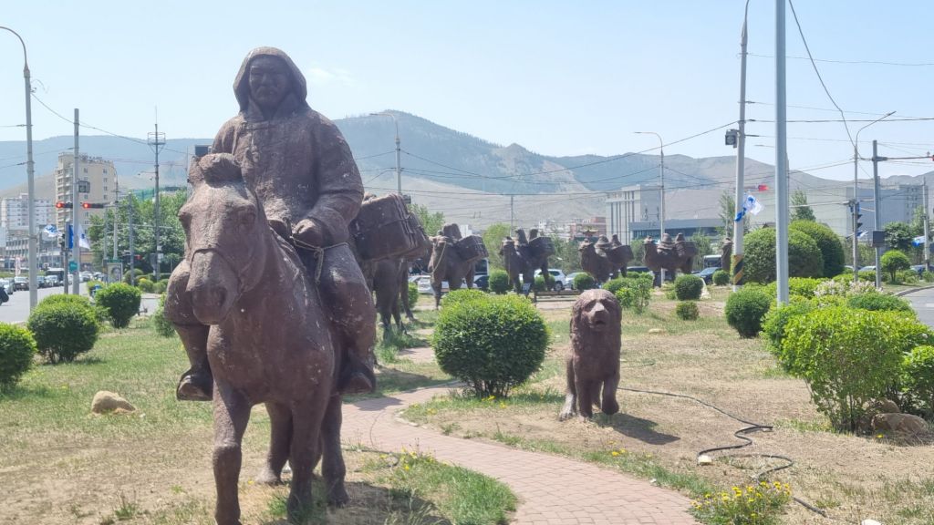 zu einem besonderen Denkmal – einer großen Skulptur zu Ehren der alten Kamel-Karawanen wurde hier ein Reiter samt Hütehund und zehn Kamelen mitten auf eine große Kreuzung gestellt.