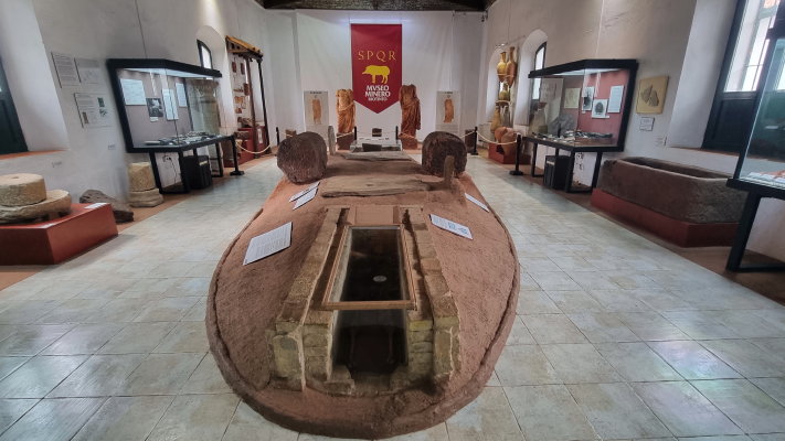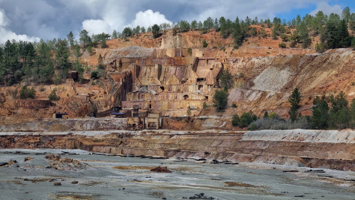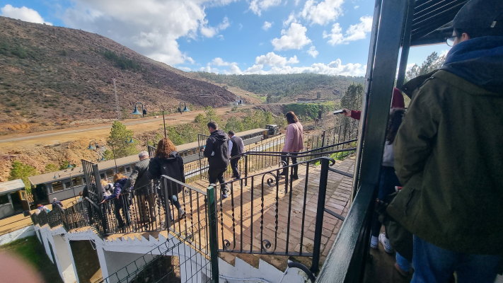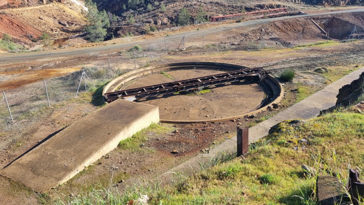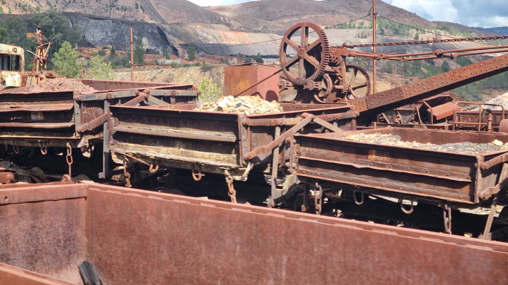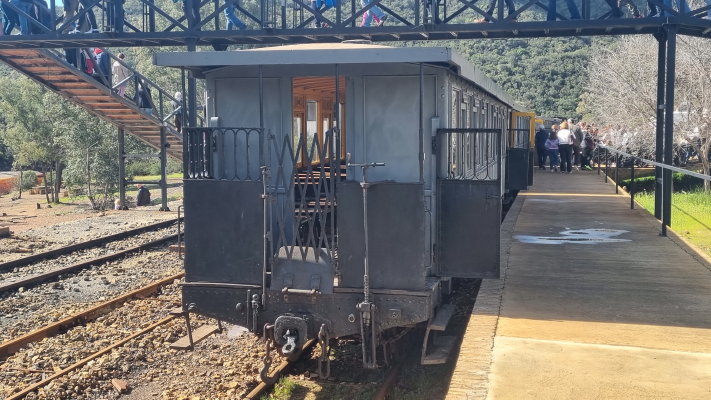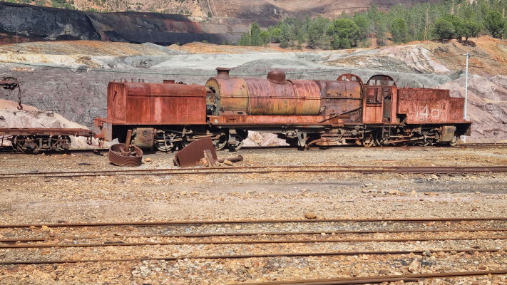 Nach zwei Wochen sollte heute eigentlich der Inhalt unseres Kompostklos erneuert werden, aber es ist wie verhext: In ganz Spanien stehen großzügig überall Müllcontainer mit Trennung, oft sogar mit Abfallbehältern für Organik, aber ausgerechnet hier sind alle Stationen per Schloss nur für Bewohner zugängig, also müssen wir das verschieben. Am nächsten Morgen sehe ich dann doch die etwas umständliche Mülllösung für die Stellplatznutzer: Über der Entsorgung ist ein kleiner Schlüsselkasten mit Zahlenschloss befestigt und darüber ein Infozettel: Man muss während der Öffnungszeiten von 16 – 18 Uhr (!) in der Verwaltung anrufen. Dort wird einem der Zahlencode mitgeteilt, dann kann man sich den Schlüssel nehmen und zum eingezäunten Müllplatz oben an der Straße gehen. Hinterher muss man versprechen, den Schlüssel auch wieder ins Kästchen zurückzulegen – umständlicher geht es nicht, außerdem stehen in allen Nachbarorten die Container für Alle zur Verfügung!? In der Extremadura sind ab heute Faschingsferien, also beeilen wir uns, um rechtzeitig auf dem nächsten Stellplatz anzukommen, denn wir wollen nach Minas de Riotinto und dort mit der Schmalspur-Museumseisenbahn fahren – das wollen sicher nicht wenige in den Ferien! Außerdem sind am Atlantik, wo wir gerne ein bis zwei Wochen pausieren wollen, für die nächsten zehn Tage Regen, Sturm und Unwetter vorhergesagt. Das geht dort schon den halben Winter so, also müssen wir uns nicht beeilen. Wir fahren bis Santa Olla auf der Autobahn und dann über Zufre nach Minas. Um 11 Uhr sind wir bereits auf dem offiziellen Stellplatz und haben tatsächlich noch einige Plätze zur Auswahl. Wir denken noch, wir hätten ganz besonderes Glück, denn am ersten Sonntag des Monats wird der Zug mit einer Dampflok bespannt – ansonsten „nur“ mit einer historischen Diesellok. Ich buche also wie empfohlen online und erschrecke, als ich das zugesendete Ticket kontrolliere, denn dort steht der Sonnabend drauf! Online melden kann man so etwas natürlich laut Homepage nicht, also ziehen wir den Museumsbesuch vor und spazieren hinauf auf den Berg, um das mit dem Ticket zu klären und uns über die Minenarbeit, die hier seit 5000 Jahren (!) stattfindet, zu informieren. Das mit dem Ticket klärt sich schnell: Der Sonntag mit der Dampflok ist natürlich schon ausgebucht und scheinbar hat uns das System automatisch auf den Sonnabend umgebucht – dann hätte uns das „System“ – oder ist das inzwischen eine „KI“? – aber auch darauf hinweisen können, dass die Fahrt an einem anderen Tag stattfindet!? Egal, wir haben ja Zeit! Das Museum ist schon sehr interessant – hier wurde sogar ein begehbarer Stollen aus der Römerzeit nachgebaut – und besonders ich als Modellbahner genieße die ausgestellten Loks und Waggons.