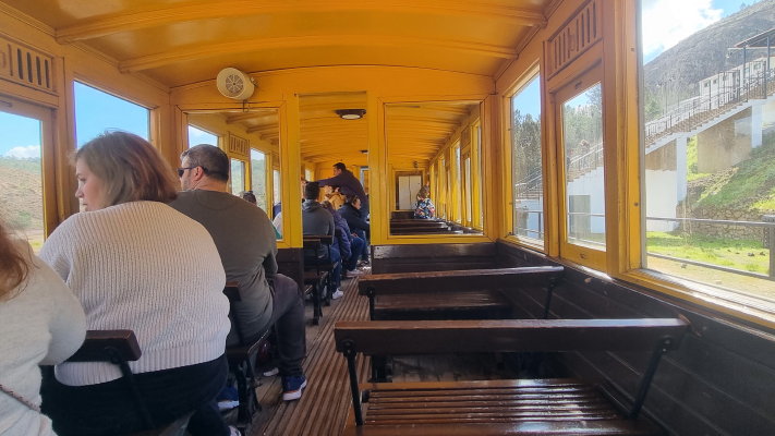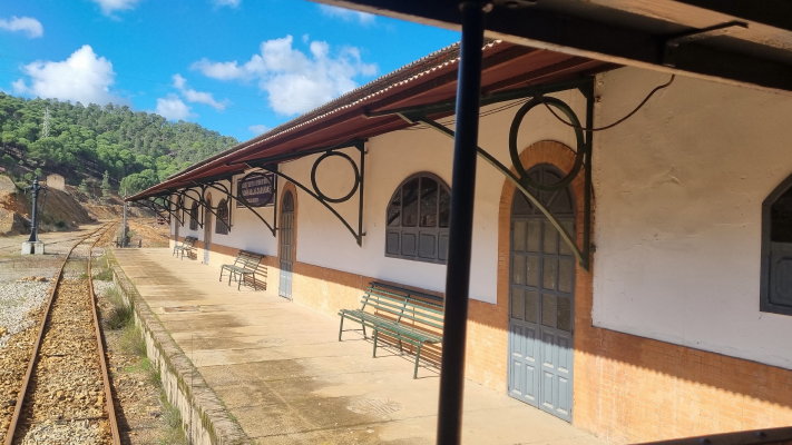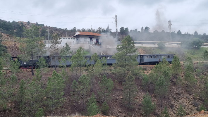 Als wir schon im Zug sitzen, treffen noch zwei weitere Busladungen ein. Alles Spanier übrigens, wir sind auf dem Zug die einzigen ausländischen Touristen! Unsere Fahrt heute mit der Diesellok bietet noch einen weiteren Vorteil: Während die Dampflokfahrt nur über 11 km verläuft, geht unsere Fahrt über die doppelte Distanz, also 22 km. Das liegt daran, dass das Gefälle bzw. auf dem Rückweg die Steigung des zweiten Streckenabschnitts für die kleine Dampflok nicht zu schaffen ist. Die Fahrt lohnt sich wirklich. Die Strecke verläuft die ganze Zeit am Rio Tinto entlang. Auf halber Strecke liegt der Bahnhof von Zarandas.