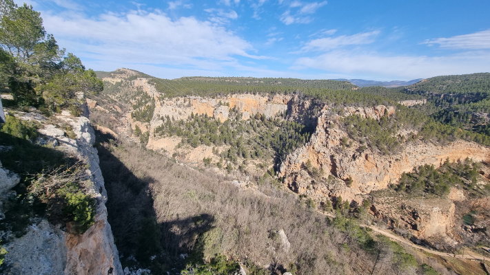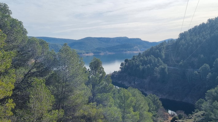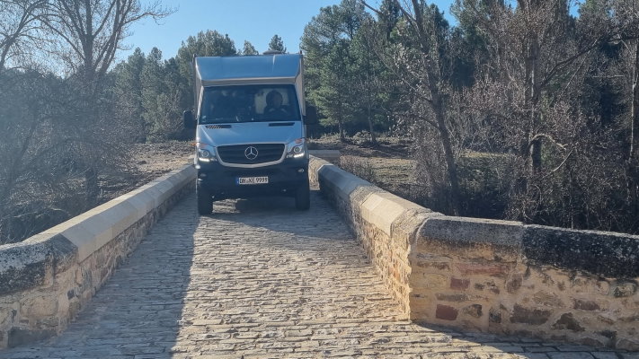 Der Stellplatz oben liegt am Schwimmbad und am Einstieg in einen idyllischen Wanderweg. Frischwasser, Abwasser, Schwarzwasser…alles da und kostenlos, was will man mehr? Die Nacht ist absolut lautlos, entsprechend erholt wachen wir am nächsten Morgen auf. Nach einem ausgiebigen Sonntagsfrühstück geht es wieder auf die Strecke, die heute noch einmal spektakulärer als gestern ist. Nach Aranuel und Montanejus führt die Straße an einem Stausee entlang nach Olba und weiter nach Venta del Aire. Von hier aus geht es auf die Autobahn, wir umfahren Teruel und nutzen die schöne N 330 um nach Torrebaja zu kommen. Von hier aus geht es auf der N 420 durch eindrucksvolle Canons über Canete zu einem Freistehplatz am Rio Cabriel. Zuerst parken wir auf einem bei Park-4-Night aufgeführten Platz an der Straße. Ein paar hundert Meter davor gibt es allerdings eine restaurierte, alte Steinbrücke. Die sieht stabil aus, ist aber nur 2,10 m breit und führt über den Fluss. Danach geht es mit tiefen Furchen auf Grobschotter 50 Meter gut bergan und dann tut sich ein großer und ebener Platz auf. Wir sehen uns an – wir können den Spruch zwar nicht mehr hören, aber hier passt er tatsächlich wieder einmal: Für Exe ist das „artgerechte Haltung“ und ein paar Minuten später stehen wir allein oben am Waldrand. Wieder Idylle pur, wieder bereuen wir keine Minute, dass wir nicht am Mittelmeer stehen.