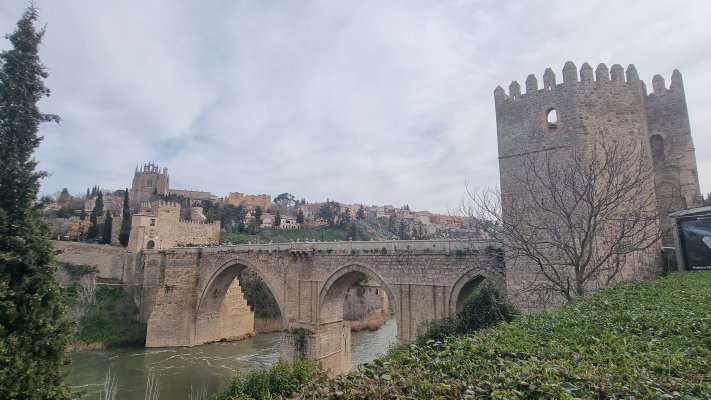 Am nächsten Morgen gönnen wir uns und Exe eine Motorvorwärmung, denn hier in den Bergen herrscht morgens noch Frost, die Scheibe ist vereist. Auf dem Rückweg macht Kathrin noch Fotos von der Brückenpassage (sieht auf Fotos immer viel harmloser aus!), dann geht es auf der N 420 über Fuentes und südlich um Cuenca herum auf die A 40. Hinter Ontigola fahren wir ein kleines Stück „Bezahlautobahn“ und auf der N 400 erreichen wir schließlich Toledo. Die hiesigen Freistehmöglichkeiten gefallen uns nicht (der Messeparkplatz z.B. ist zwar riesig, wirkt aber weder einladend noch besonders sicher) und so besuchen wir den zwar nicht gerade günstigen (33 € pro Nacht), aber gut gelegenen, sauberen und ruhigen Campingplatz „El Greco“ auf. Wir nutzen Campingplatzaufenthalte immer auch für alle möglichen Services aus – das gilt für Exe genauso wie für uns! Am nächsten Tag machen wir die Fahrräder klar, radeln rund 2 km bis zur schönen Fußgängerbrücke über den Tajo und bestaunen die Zip-Liner, die hier direkt neben der Brücke den Fluss überqueren.