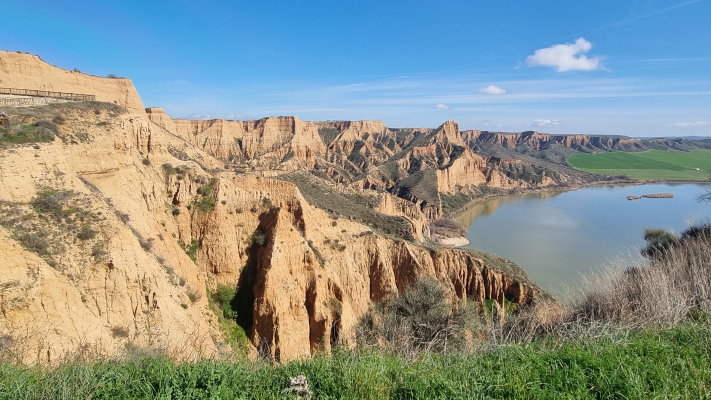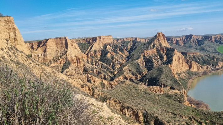 Nach einem weiteren „Büro- und Hausarbeitstag“, u.a. mit Brotbacken und verschiedenen Mailkontakten in die Mongolei (da geht unsere nächste Tour hin – allerdings wie im südlichen Afrika wieder mit einem Mietcamper) geht es nur rund 30 Kilometer nach Westen zu den Barrancas de Burujón. Hier hat sich der gestaute Fluss in weiches Erosionsgestein gegraben und man kann das Ergebnis auf einem 5,5 km langen Rundwanderweg mit vielen Aussichtspunkten bestaunen: Durch Erosion ist hier der „Colorado Canyon von Toledo“ entstanden, wie er scherzhaft genannt wird – uns erinnert das mehr an die Erosionsgebilde des Brice Canyons, wenn denn schon unbedingt ein amerikanischer Vergleich ran muss. Wir finden das Ganze auch so eindrucksvoll – erst recht mit einem Pulk von über 100 Kranichen, die über dem See in der Thermik kreisen.