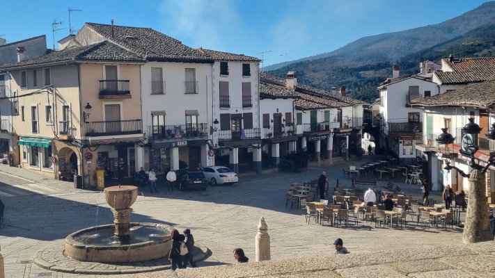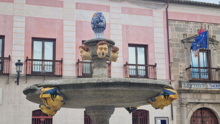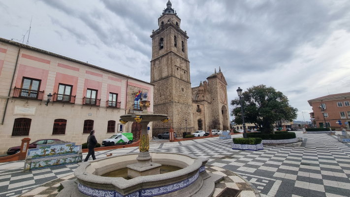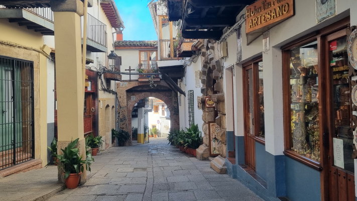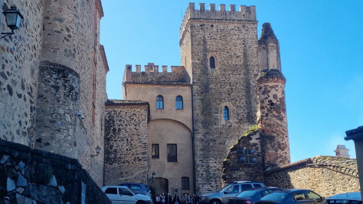 Am nächsten Morgen macht Kathrin wieder ein paar Fotos von der „Abfahrt“, dann geht es die paar Kilometer bergab nach Guadalupe. Nach Empfehlung soll man über die Zufahrt „Guadalupe Sur“, also über den Süden in die Stadt, weil es sonst eng werden könnte. Irgendwie sind wir dieses Mal zu blöd. Wir lassen die erste Zufahrt aus und nehmen die zweite – mit dem Gedanken, das wird wohl der südliche Zugang sein, steht wohl nur nicht „Sur“ dran. Wir fahren immer den Busschildern hinterher und landen prompt am Nordeingang!? Also drehen wir um und folgen den Anweisungen von Google Maps. Nun – so hätten wir uns eigentlich den Stadtrundgang sparen können, mehr Innen- und Altstadt geht nicht, denn wir fahren direkt über die Plaza Major, am Brunnen und der eindrucksvollen Treppe der Wallfahrtskirche vorbei zum Pilgerparkplatz, der nicht nur ideal zum parken, sondern auch für eine Übernachtung gut ist. Okay, war mit Exe kein Problem – mit einer größeren „Weißware“ aber vielleicht schon. Natürlich erkunden wir trotzdem zu Fuß den Ort, der selbstverständlich „Tourismus pur“ ist und zu den schönsten Pueblos Spaniens gehört. Die Altstadt bietet ein komplett historisch erhaltenes Stadtbild.