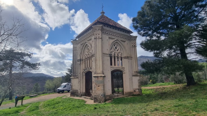 Die Aussicht ist toll, die Lage direkt neben der gutbefahrenen Straße ist es nicht und die Überreste des Tempels eher spärlich. So fahren wir gegen 14 Uhr weiter nach Castanar de Ibor und dort zum Infocenter an der Höhle. Die dortigen Stellplätze sind selbst uns zu schief, das Infocenter macht erst in zwei Stunden auf, also fahren wir weiter zur Ermita del Humillades, kurz vor dem Pilgerort Guadalupe gelegen. Die Ermita liegt auf einem Hügel über der Stadt mit einer fantastischen Aussicht. Eingerichtet wurde sie wohl für die Pilger, die hier noch einmal Rast machen konnten – ihr Pilgerziel direkt vor Augen. Nachteil des absoluten Traumplätzchens: Die Anfahrt ist nicht so einfach. Es geht in steilem Winkel von der Straße ab und knapp hundert Meter steil bergan. Bodenfreiheit und kurzer Hecküberhang sind wieder einmal gefragt – und erneut für uns eine leichte Übung! Die Belohnung ist ein einsamer, sehr leiser Stellplatz (nur Eulen und ein paar Katzen sind zu hören!) mit atemberaubender Aussicht!
