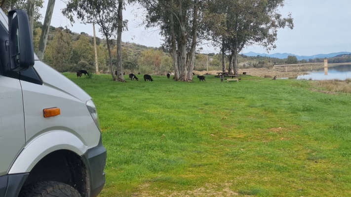 Wieder zurück, planen wir die nächsten Tage und fahren schließlich über die CC-171 (die war eigentlich als südliche Zufahrt gemeint!) aus dem Ort hinaus und auf die EX-102. Es geht hinauf zum 800 m Pass. Hier legen wir einen kleinen Zwischenstopp ein und sehen uns die geologischen „Fallas“-Verschiebungen der Erdkruste an – sorry, die sind wirklich kaum zu erkennen! Hier biegen wir aber auf die EX-316 ab und fahren über Valdecaballeros hinunter zum Stausee. Hier finden wir unseren Stellplatz für die nächsten zwei Tage – idyllisch, ruhig und friedlich.