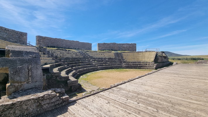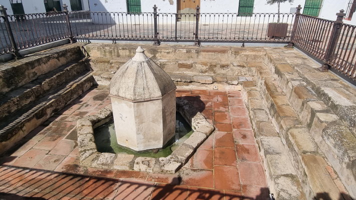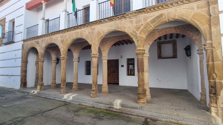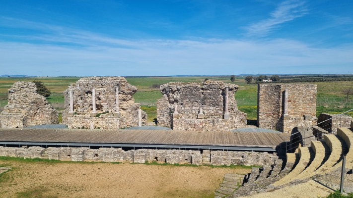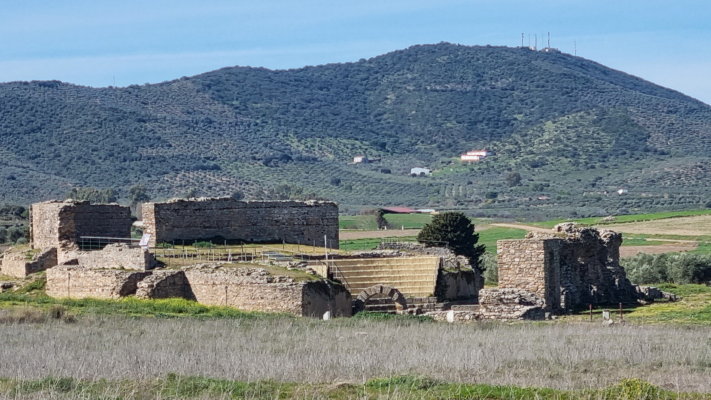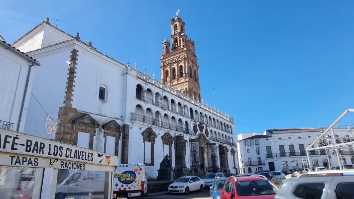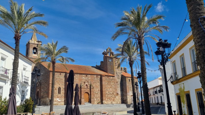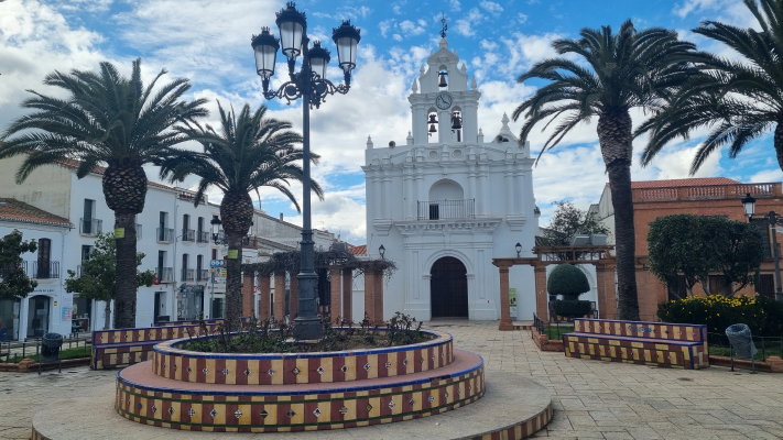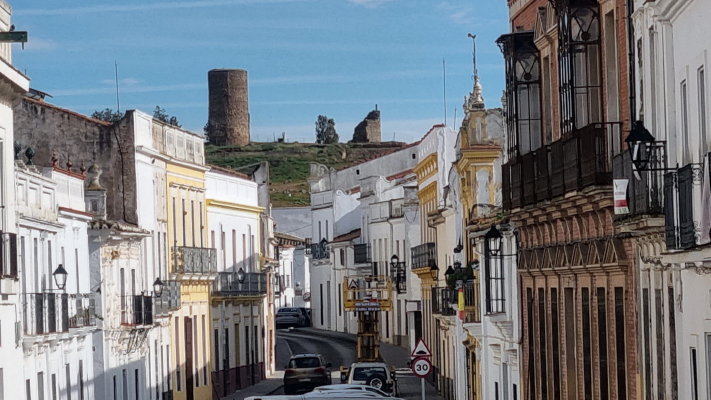 Außer einem orientalischen Hobbymusiker, der in der Nacht zwar leise, aber doch deutlich hörbar irgendwo auf dem Riesenplatz geübt hat, war es ausgesprochen ruhig hier und so geht es nun erholt weiter nach Llerena, der „Araberstadt“, also ein Ort mit deutlich maurischen Anklängen. Hier wird gerade für den Karneval geschmückt und das große Festzelt auf der Plaza vor der Kirche aufgebaut. Nach einem Abstecher zur römischen Ausgrabungsstätte „Teatro de Regina“ bei Casa de Reina wollen wir eigentlich auf den Stellplatz von Fuente del Arco, denn von hier aus gibt es einen schönen Wander- und Radweg, den wir vorhaben, morgen sportlich zu befahren.