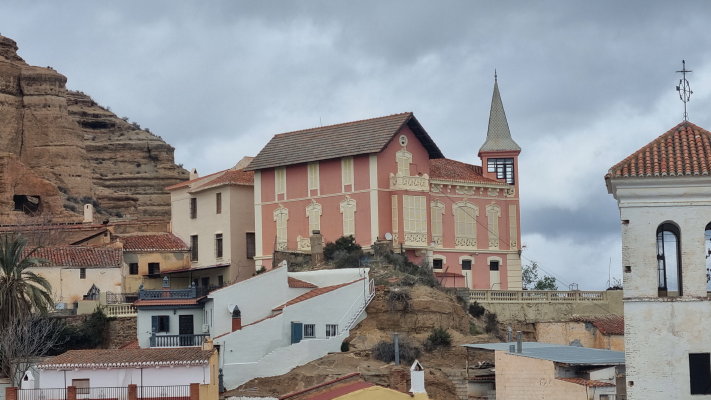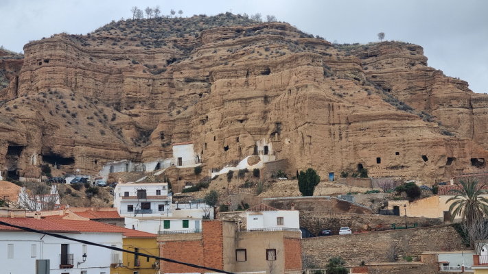 Die Langzeitcamper berichten, dass es so schon den ganzen Winter über war. Schließlich haben auch wir vom ewigen „Aprilwetter“ die Nase voll (zwei kurze Strandspaziergänge in der ganzen Zeit entspricht nicht dem sonstigen Mittel und auch nicht unserem Geschmack!) und machen uns auf den Rückweg. Eine neue Station ist dabei Marchal in der Nähe von Guadix. Hier gibt es wie in der benachbarten Stadt Höhlenwohnungen zu sehen, allerdings auch die „Röhren“ der Badlands – in den USA heißen die Erosionsgebilde „Hoodies“ und sie entstehen an den Berghängen besagter Badlands, weil das Gestein sehr weich ist und es damit zu verstärkten Auswaschungen kommt.